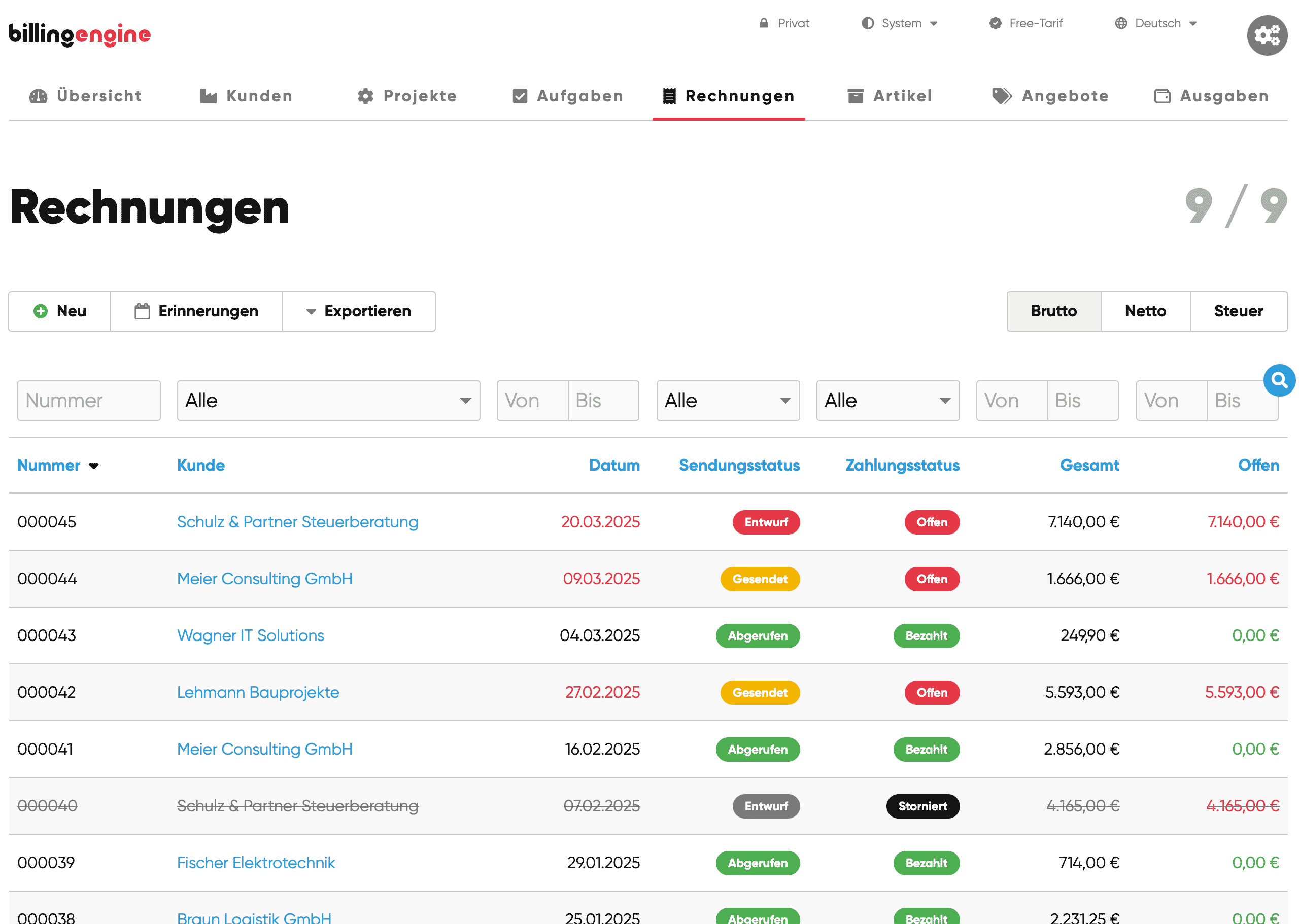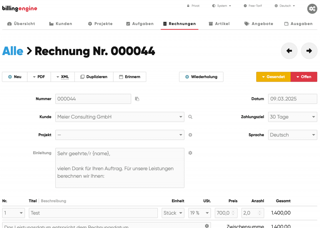 - E-Rechnung: Die ab dem 01.01.25 so wichtige Erstellung und Erfassung von E-Rechnungen wird ebenfalls in BillingEngine unterstützt. Allerdings ist das Schreiben beim kostenlosen Plan begrenzt auf drei Rechnungen.