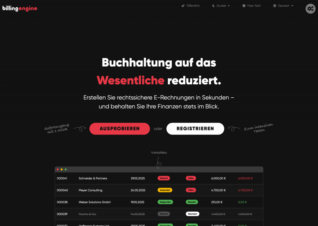 In diesem Beitrag nehmen wir den E-Rechnungsanbieter bzw. E-Rechnungsprogramm BillingEngine genauer unter die Lupe und beurteilen den Funktionsumfang sowie die Oberfläche und Tarife des Anbieters. Die Software BillingEngine ist ein deutsches Unternehmen mit dem Sitz in Hamburg und wurde speziell für Einzelunternehmer sowie kleinere Agenturen entwickelt. Die Lösung fokussiert sich darauf, Rechnungen schnell, zuverlässig und rechtssicher zu erstellen und zu versenden – ganz ohne nervige Komplexität. Im gratis Tarif können bis zu 3 Rechnungen pro Monat kostenlos erstellt werden. Ideal zum Start, um das System kennenzulernen und erste Rechnungen zu versenden.